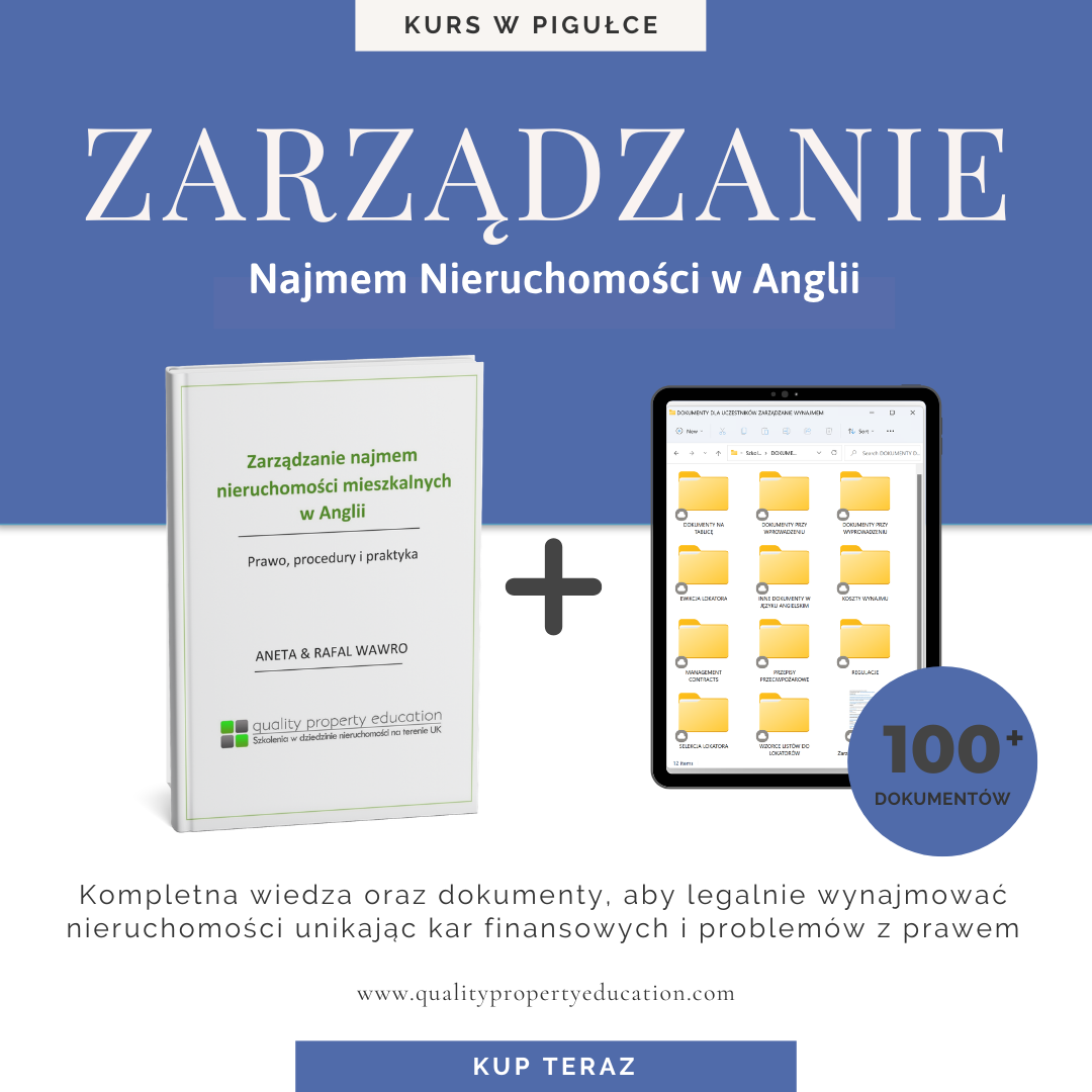 Kurs ‘Zarządzanie najmem nieruchomości mieszkalnych w Anglii’ (uaktualniona 09.03.2026) w formie książki został opracowany przez Anetę oraz Rafała Wawro, którzy mają kilkuletnie doświadczenie w prowadzeniu swojej własnej agencji zarządzania wynajmem HMO w UK oraz swoich własnych nieruchomości mieszkalnych. Przeczytaj więcej o Anecie i Rafale na stronie ‘O Nas’